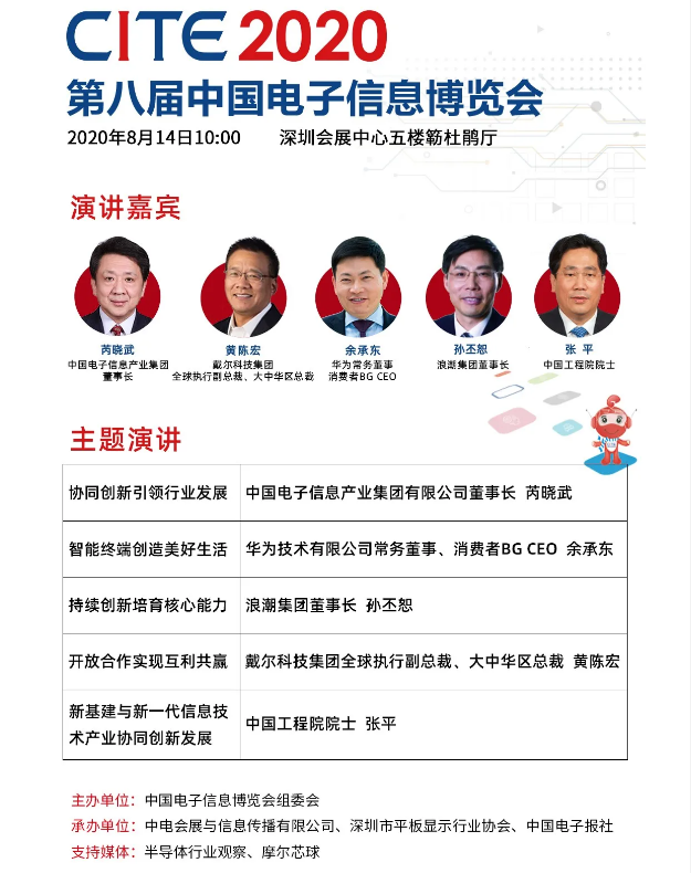 ?2020年8月14日-16日在深圳市將舉辦第八屆中國電子信息博覽會,并于2020年8月14日在深圳會展中心舉行“第八屆中國電子信息博覽會開幕式暨中國電子信息行業企業家峰會”。